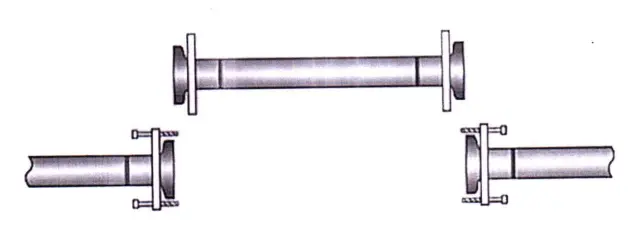 تعمیر ماسوره یا فلنجی بعد از گزارش آسیب دیدگی خط لوله، باید اندازه و سمت ابعاد خط لوله را مشخص نمود. فلنج و رینگ لوله آسیب دیده را از سیستم لوله کشی بیرون کشیده و برای انجام تعمیرات، به کار می روند. مجموعه ماسوره فلنجی، کافی است بین سر فلنج ها را با لوله اصلی، جوش لب به لب به روش مناسب جوش داده و سپس لوله جایگزین را در بخش آسیب دیده قرار داده می شود. شکل زیر به صورت شماتیک این مراحل را نشان می دهد