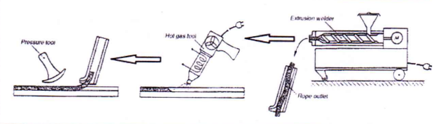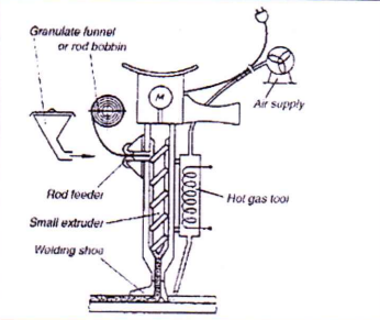 ابزار جوشکاری دستی شامل یک اکسترودر کوچک میباشد برای پیش گرمایش اتصال جوشی یک ابزار گاز داغ معمولی با منبع هوای خارجی متصل میشود.